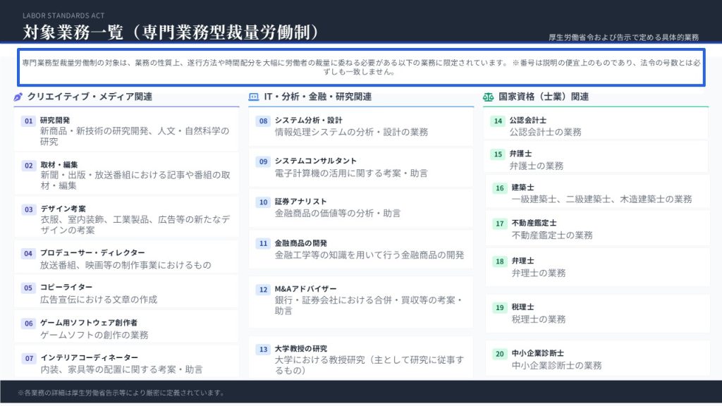 ⑥その他厚生労働大臣の指定する業務(コピーライター、システムコンサルタント、インテリアコーディネーター、ゲーム用ソフトウェアの創作、証券アナリスト、金融商品の開発、大学における教授研究、公認会計士、弁護士、建築士、不動産鑑定士、弁理士、税理士、中小企業診断士、銀行・証券会社における顧客への合併・買収等の考案・助言の業務)