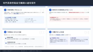 ⑥その他厚生労働大臣の指定する業務(コピーライター、システムコンサルタント、インテリアコーディネーター、ゲーム用ソフトウェアの創作、証券アナリスト、金融商品の開発、大学における教授研究、公認会計士、弁護士、建築士、不動産鑑定士、弁理士、税理士、中小企業診断士、銀行・証券会社における顧客への合併・買収等の考案・助言の業務)