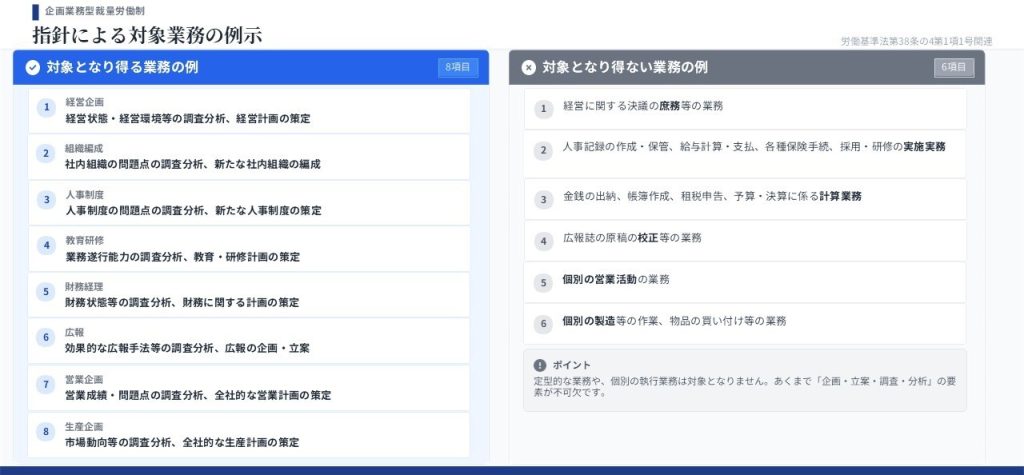 企画業務型裁量労働は、事業運営に関する事項についての企画・立案・調査・分析の業務であって、当該業務の性質上これを適切に遂行するにはその遂行方法を大幅に労働者の裁量に委ねる必要があるため、当該業務の遂行手段や時間配分の決定等に関して使用者が具体的な指示をしないこととする業務が対象です(労基法38条の4第1項1号)。