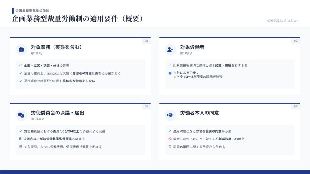 専門業務型裁量労働制のように、対象業務が法定されているわけではなく、抽象的な要件に当てはまれば広く対象となり得るところが特徴です。